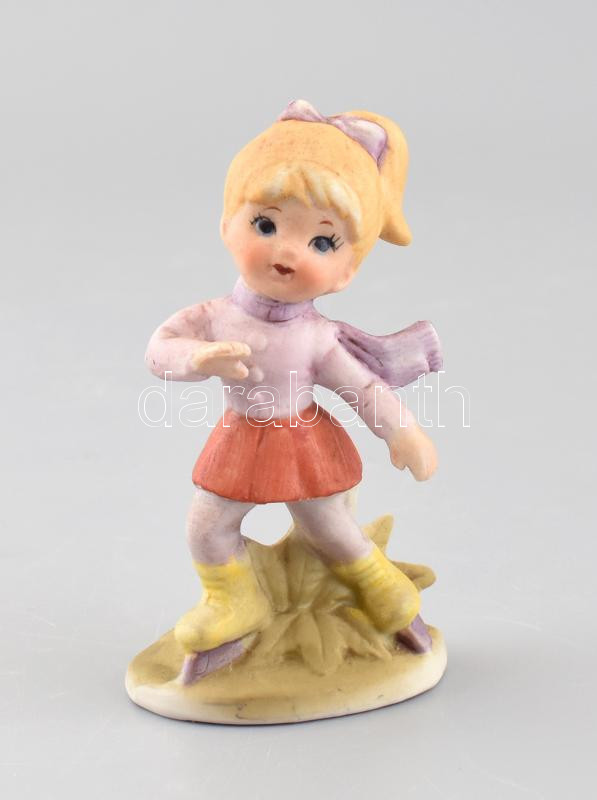 Korcsolyázó kislány, biszkvit porcelán figura, kézzel festett, jelzetlen, kisebb kopásokkal, m: 10 cm