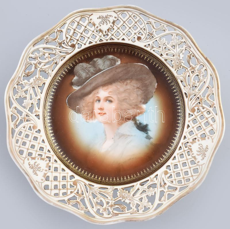 Schumann Dresden talpas kínáló, kínáló felületén részben kézzel festett kalapos hölgy képével, áttört mintával, jelzett, kopással, d: 21 cm, m: 10,5 cm