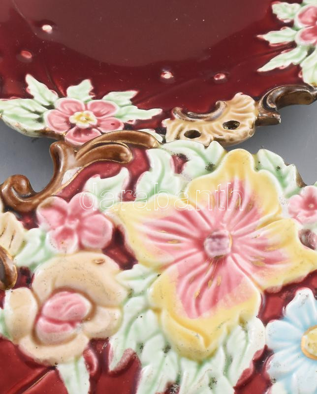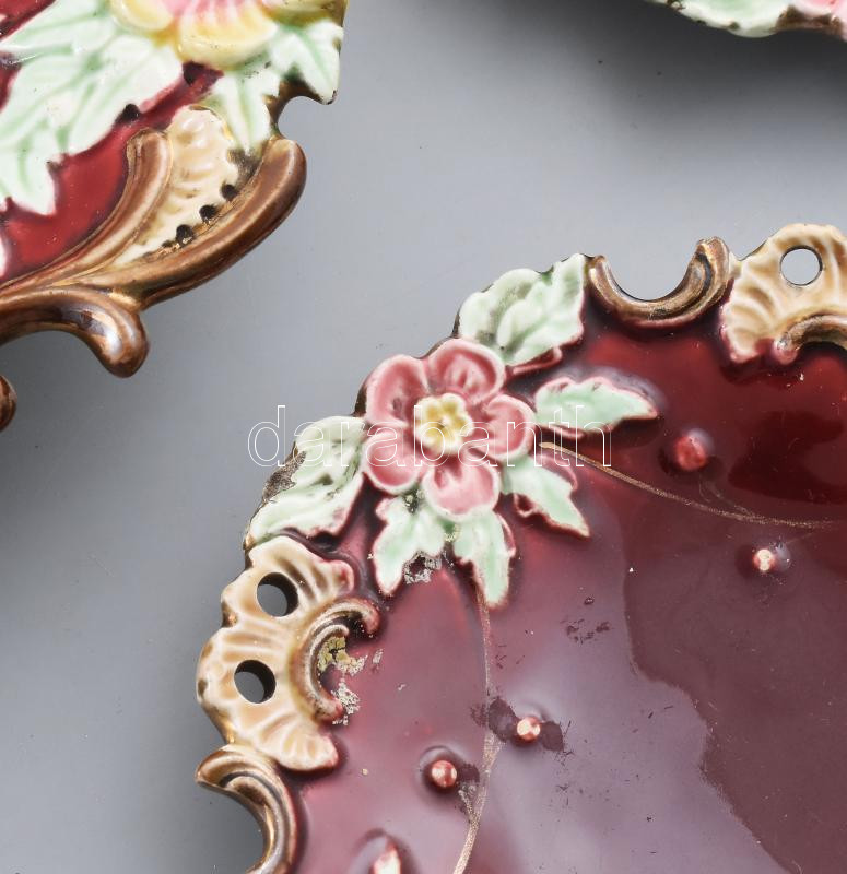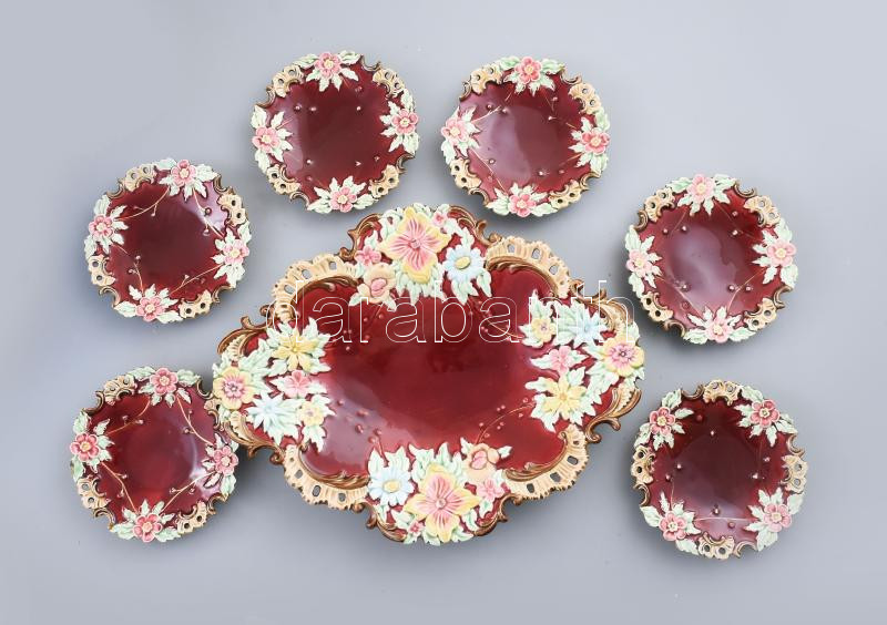 Description: Szecessziós süteményszervírozó szett, tálca + 6 db kínálótál, magastüzű mázakkal festett finomfajansz, formaszámmal jelzett, kopással, 2 tálon sérüléssel, 36x28 cm, illetve d: 15 cm