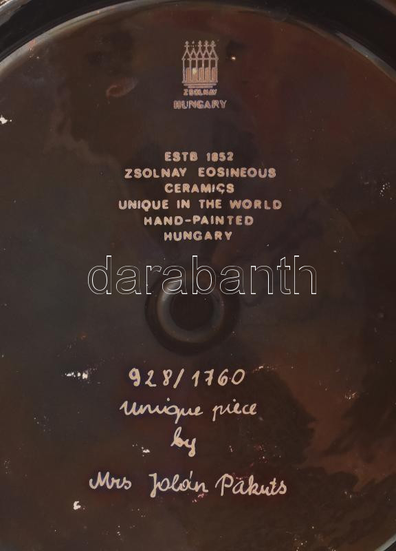 Zsolnay dísz váza. Többtüzű mázakkal. Palástján virág díszítménnyel. Jelzett: Zsolnay Hungary 928/1760 Unique piece by Mrs. Jolán Pakuts, szép állapotban. m: 27,5 cm, d: 23 cm. Gyűjtői darab