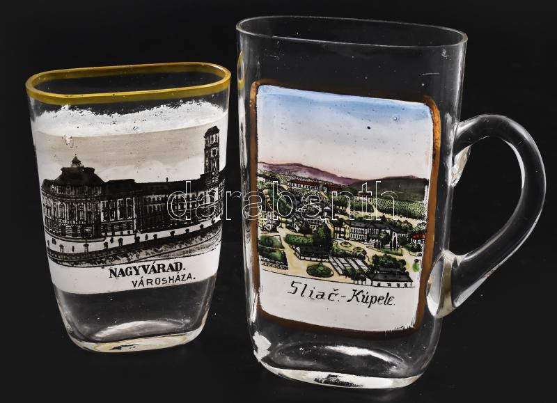 2 darab antik kúrapohár, közte Nagyvárad, pattogzással, m: 10-12,5 cm