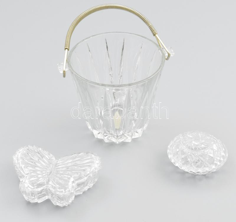 3 db üveg tárgy: jégvödör 12 cm, pillangós dobozka 11 cm, kis bonbonniere 7 cm