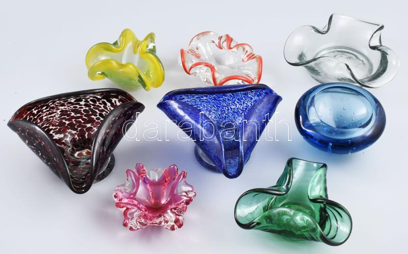 8 darab régi és antik cseh üveg asztaldísz, színezett és áttetsző hutaüvegek, jelzés nélkül, hibátlan, d: 9-14 cm