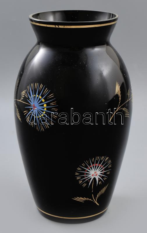 Antik hialitüveg váza, zománc festéssel, hibátlan, m: 25,5 cm