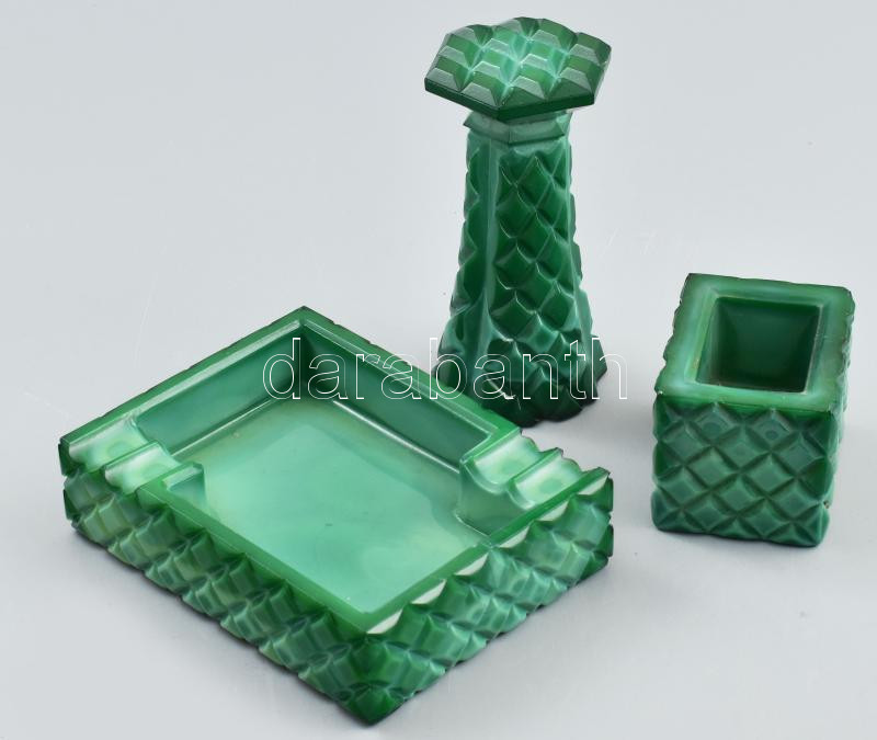 Antik malachitüveg asztali szett, 3 darabos, jelzés nélkül, minimális kopással, 12x9 cm, 6,5x5 cm, m: 10,5 cm