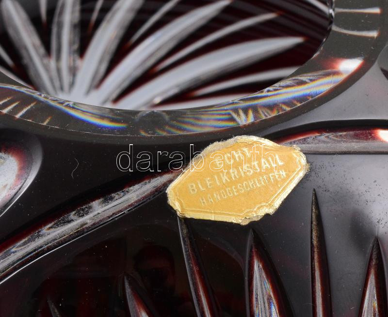 Bíbor ólomkristály váza, gazdag korongozott díszítéssel, címkével jelezve, kis kopással, m: 15 cm