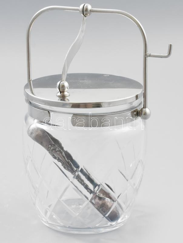 Csiszolt mintás kristály kockacukor kínáló, ezüstözött szerelékkel, cukorfogóval, jelzéssel, kopással, m: 18 cm