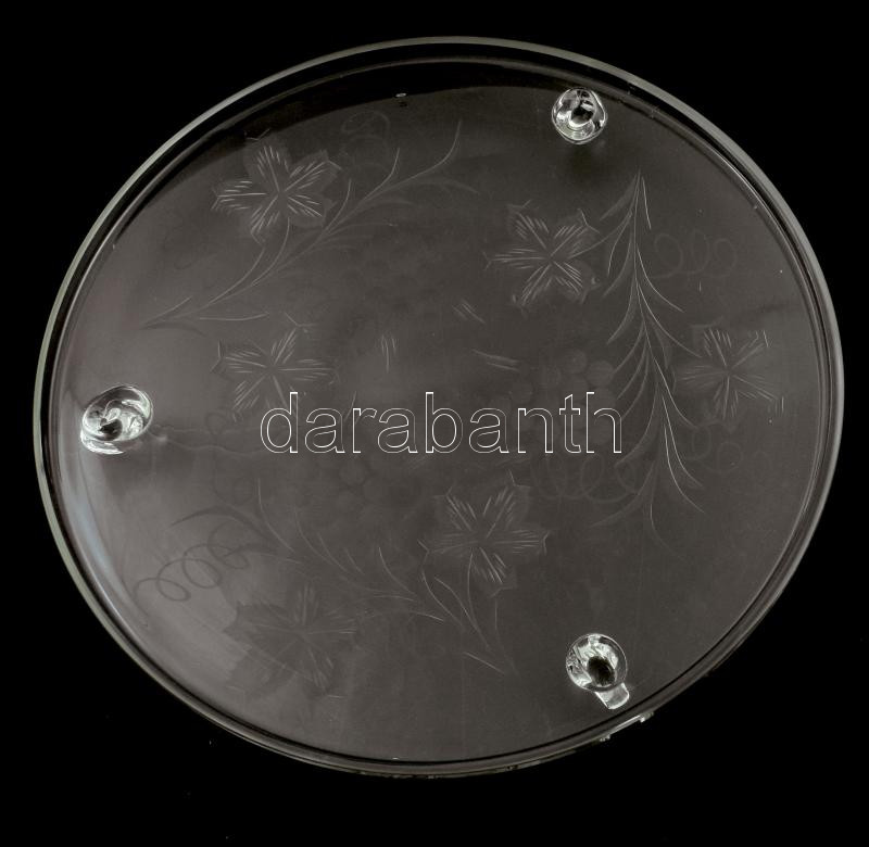 Csiszolt szőlőmintával díszített üveg tortatál, 3 lábon álló, jelzetlen, minimális kopottsággal, d: 32,5 cm