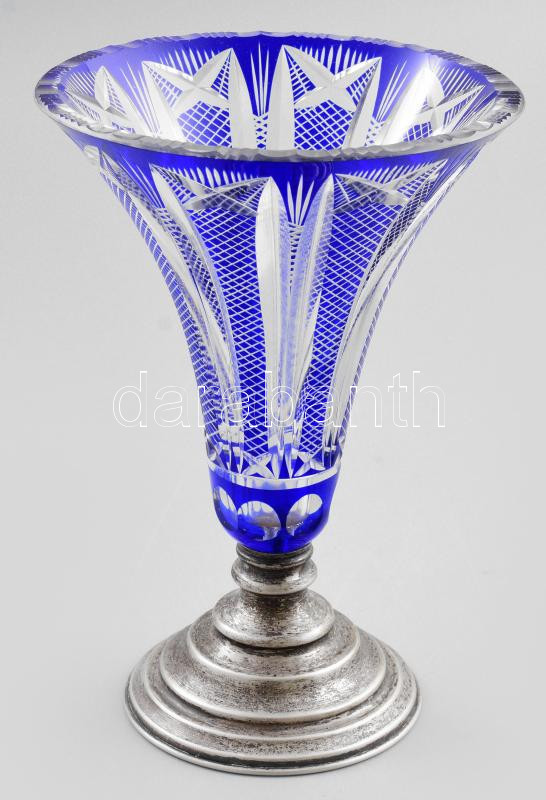 Kristály váza, kék pácolással, ezüst (Ag) talpazattal, jelzett, kis kopással, m: 18 cm