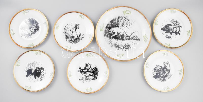 Salgótarjáni Síküveggyár vadászmintás üveg süteményes készlet, eredeti dobozában, d: 18-24 cm