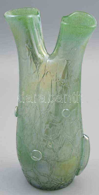 cca 1950 Francia irizáló zöldes üveg kétágú fatörzsváza. Jelzés nélkül...