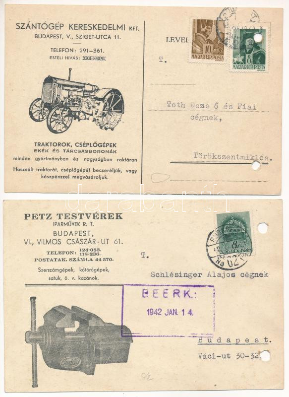 2 db RÉGI magyar lyukasztott reklám képeslap: Szántógép Kereskedelmi kft., Petz Testvérek Iparművek rt.