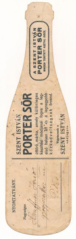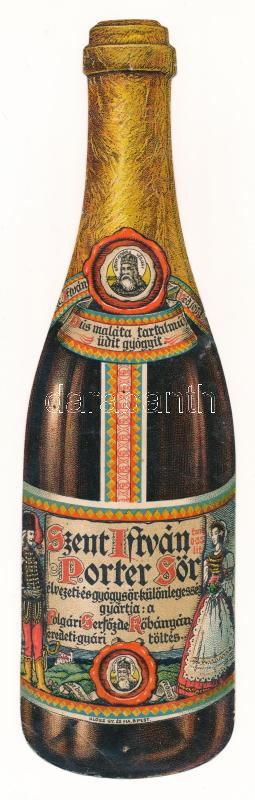 Description: A Szent István Porter sör minden terített asztal dísze. Sörös üveg alakú reklám képeslap. Klösz Gy. és fia litho / Hungarian beer bottle sahped advertisement (26 x 7,3 cm) (lyukak / pinholes)