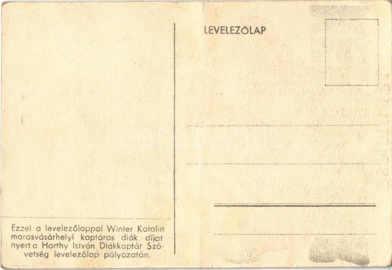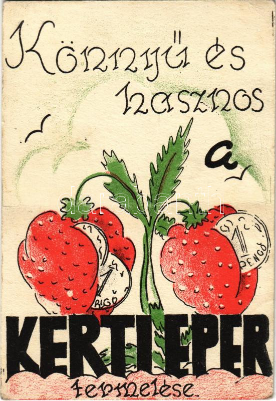 Description: Könnyű és hasznos a kerti eper termelése. Ezzel a levelezőlappal Winter Katalin marosvásárhelyi kaptáros diák díjat nyert a Horthy István Diákkaptár Szövetség levelezőlap pályázatán / Hungarian Youth Association propaganda art postcard s: Winter Katalin (EK)