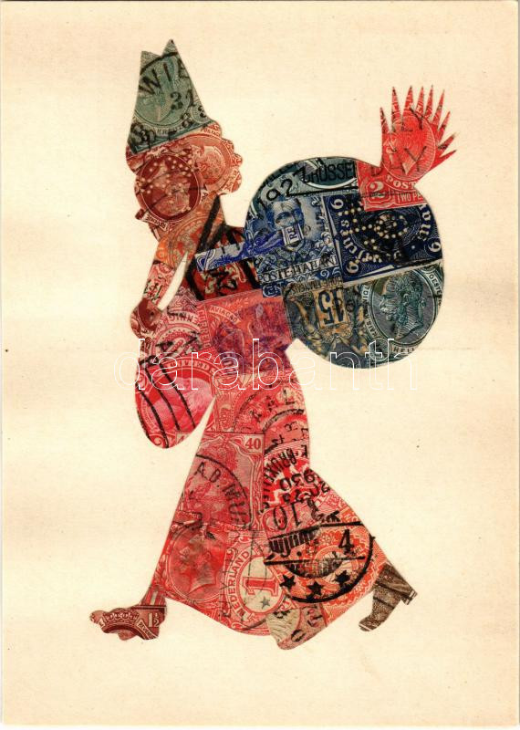 Mikulás. Bélyegekből kivágott és összeragasztott képeslap. Budai nyomda / Saint Nicholas. Made out of stamps