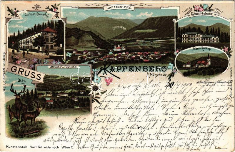 1900 Kapfenberg (Steiermark), Curhaus Steinerhof, Steinerhof u. Fürstenhof, Curhaus Fürstenhof, Maria Rehkogl. Art Nouveau, floral, litho (EK)