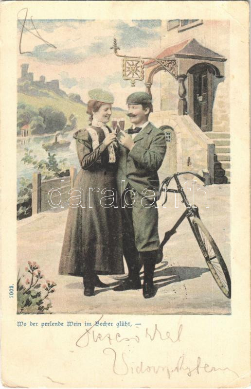 1900 Wo der perlende Wein im Becher glüht / Borozó pár kerékpárral / Couple drinking wine, bycicle (Rb)