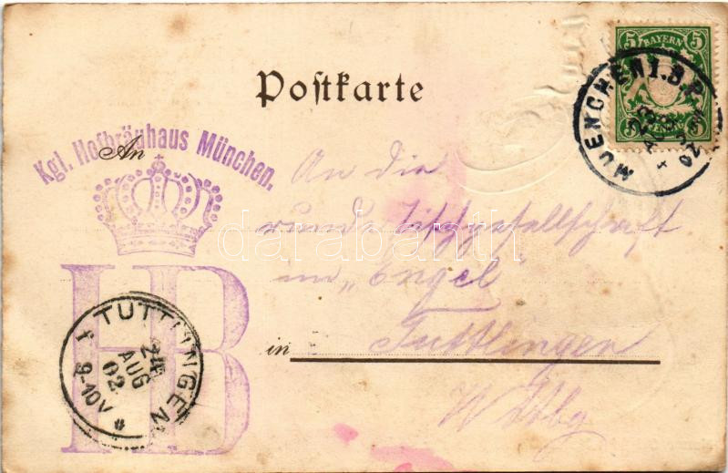 1902 Gruss vom Münchner Hofbräuhaus. Neuer Original Hofbräuhaus-Maasskrug / Német dombornyomott sörös korsós reklámlap / German brewery advertisement, beer mug - embossed litho (fl)