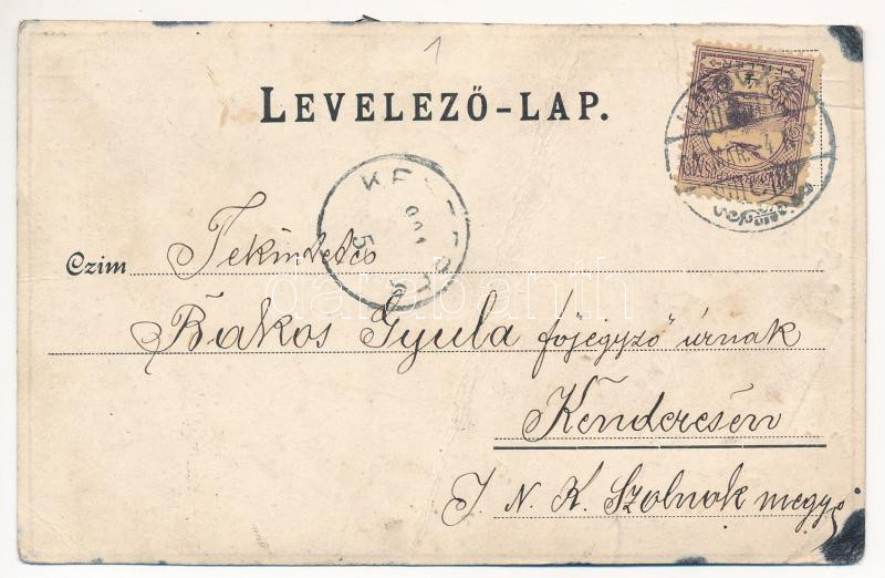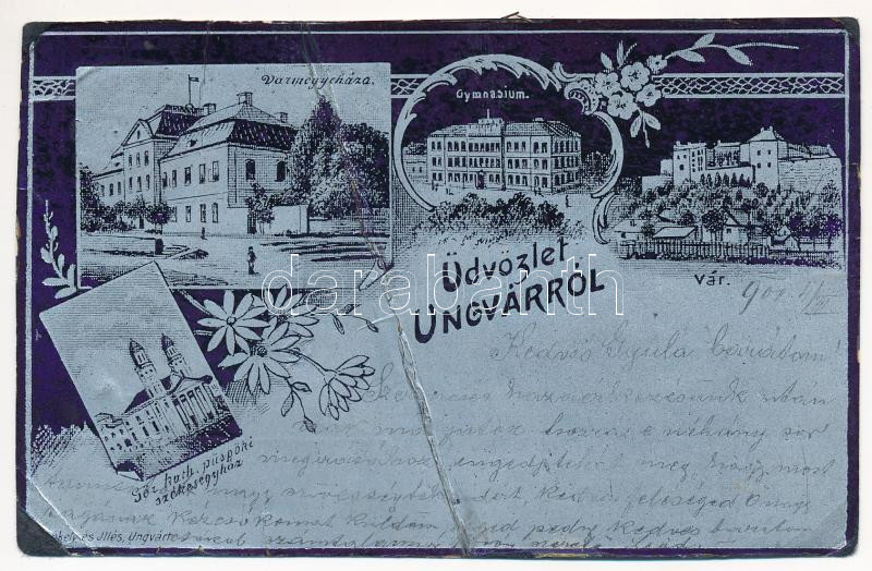 1901 Ungvár, Uzshorod, Uzhhorod, Uzhorod; Vármegyeháza, vár, gimnázium, Görögkatolikus püspöki székesegyház. Székely és Illés kiadása. Szecessziós virágos fémes hatású fóliás képeslap / county hall, grammar school, castle, cathedral. Art Nouveau, floral, metallic foil postcard (vágott / cut)
