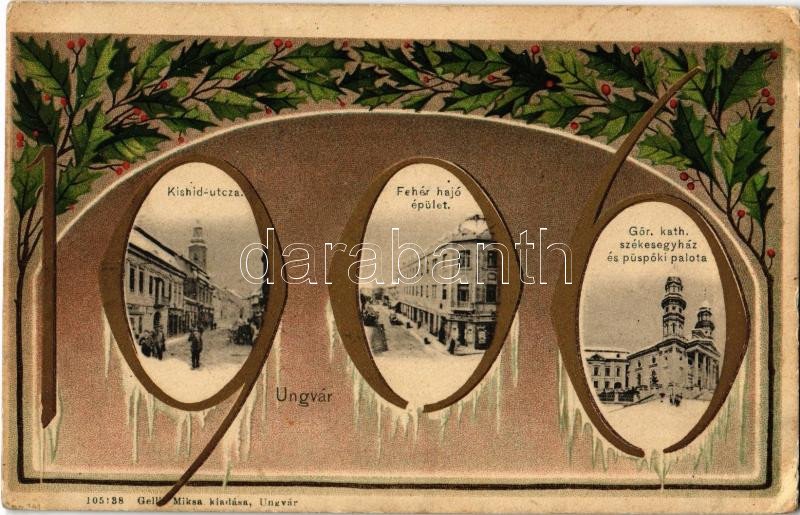 Description: 1906 Ungvár, Uzshorod, Uzhhorod, Uzhorod; Kishíd utca, Fehér hajó épület, Görög katolikus székesegyház és püspöki palota, téli montázs. Gelli Miksa kiadása / street, cathedral. Art Nouveau winter montage, litho (EK)
