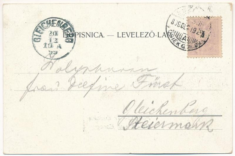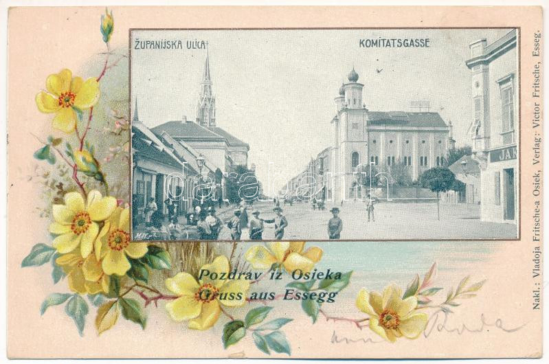 1899 (Vorläufer) Eszék, Essegg, Osijek; Zupanijska ulica / Comitatsgasse / utca, zsinagóga, piac / street, synagogue, market. Victor Fritsche Art Nouveau floral, litho