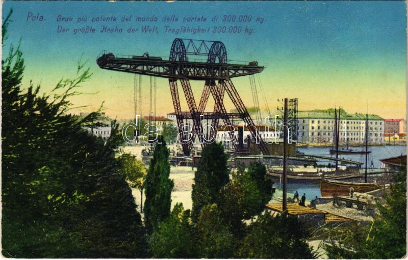 1915 Pola, Pula; Der größte Krahn der Welt. Tragfähigkeit 300,000 kg /... https://www.darabanth.com/en/457-Online-auction/457.0/Postcards/Croatia~1000009/1915-Pola-Pula-Der-groC39Fte-Krahn-der-Welt-Tragfahigkeit-300-000-kg-A-vilag-legnagyobb-daruja~II3025747