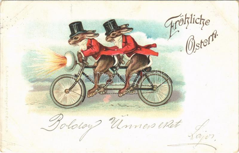 1900 Húsvéti üdvözlet! Kerékpáros nyulak / Fröhlichte Ostern / Easter greeting, rabbits on tandem bicycle. E.A. Schwerdtfeger & Co. 3102. litho (EK)