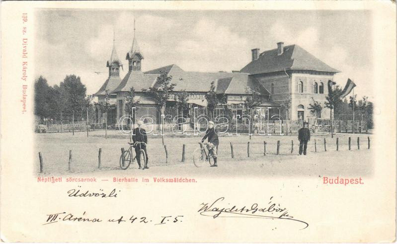 1900 Budapest X. Népligeti sörcsarnok, Heinczel Mihály Nagy sörcsarnoka és vendéglője, kerékpárosok, Divald Károly 139. (EK)