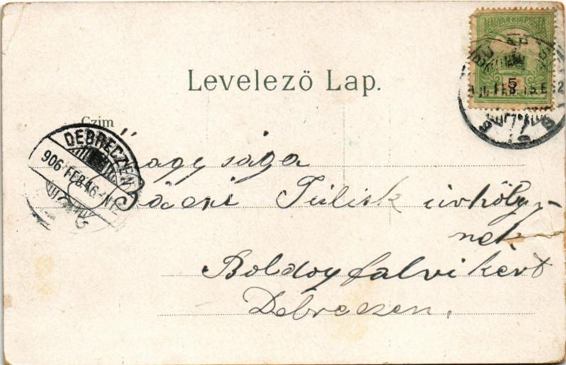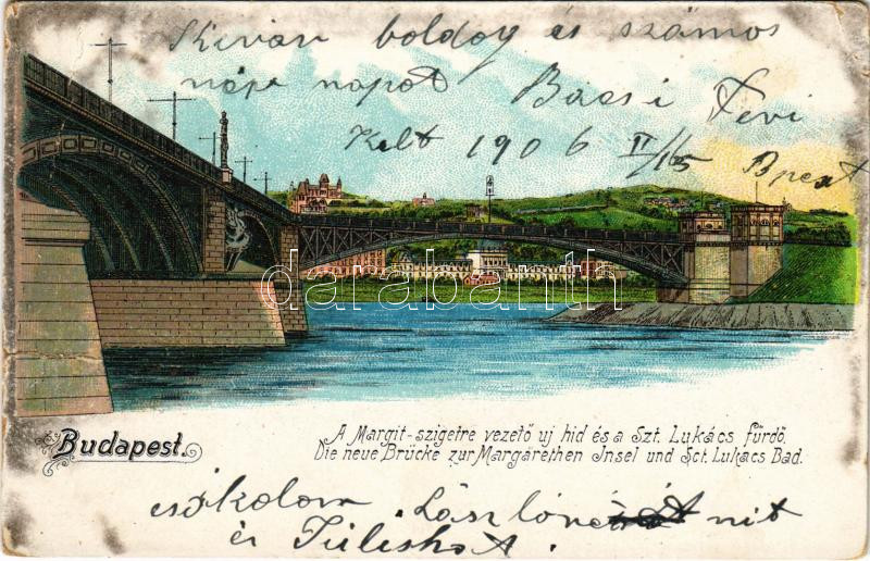 1906 Budapest, Margit szigetre vezető új híd és Szt. Lukács fürdő. litho (szakadás / tear)