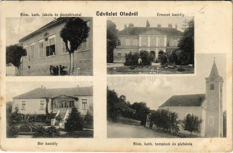 1915 Szombathely, Olad, Római katolikus templom, plébánia és iskola, postahivatal, Ernuszt és Bér kastély (fl)