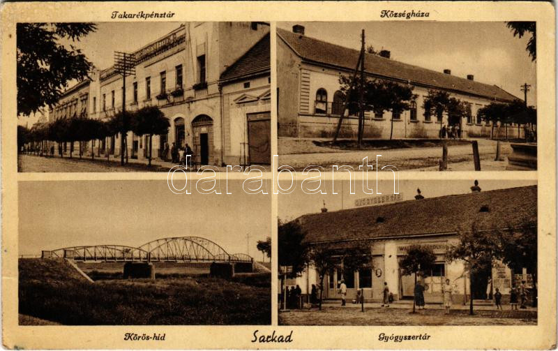 1944 Sarkad, Takarékpénztár, Községháza, gyógyszertár, Körös híd, üzletek (EK)