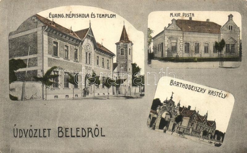 Beled, Evangélikus népiskola és templom, Posta, Barthodeiszky kastély....