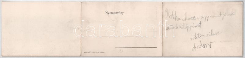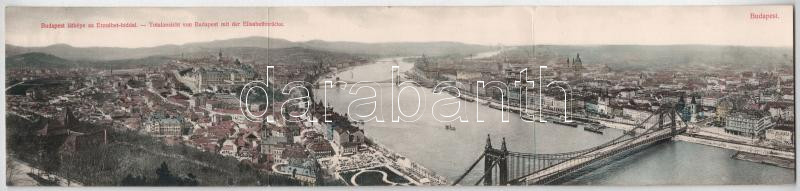 Description: Budapest, Általános látkép Budáról nézve, Tabán, Krisztinaváros, Erzsébet híd. Három-részes kihajtható panorámalap, Divald Károly 1676-1907. / 3-tiled folding panoramacard (r)