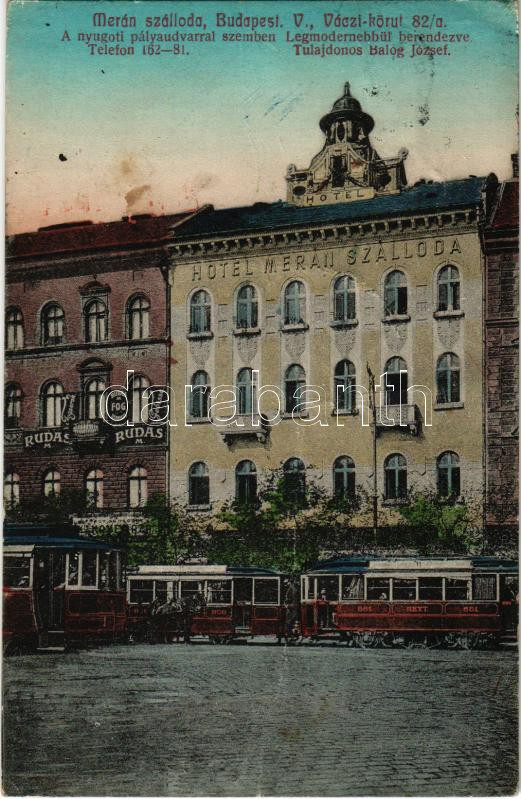 Budapest V. Merán szálloda, Rudas M. fogorvos, villamosok. Váczi körút 82/a. (ma Nyugati tér 8.) (Rb)