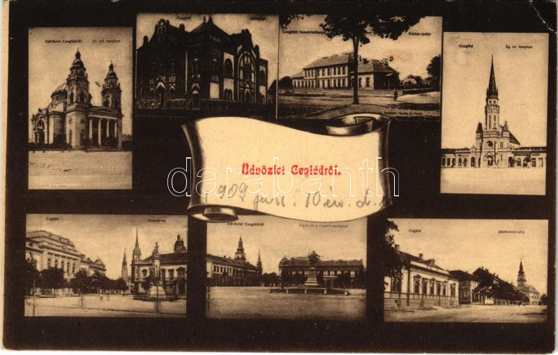 Description: Cegléd, Református templom, zsinagóga, huszárlaktanya kórház épület, Evangélikus templom, Kossuth tér, Árpád tér a Kossuth szoborral, Jászberényi utca. Sebők Béla kiadása (EK)