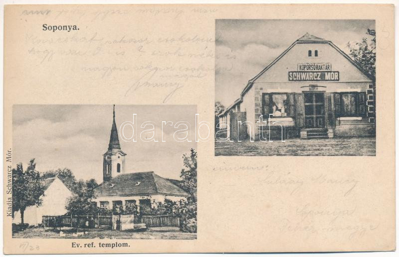 Soponya, Református templom, Schwarcz Mór koporsóraktára, üzlete és saját kiadása (EK)