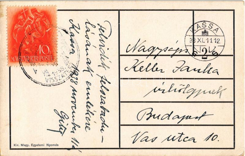 Description: 1938 Virágos Budapest, virágos Magyarország. Virágos út vezessen virágos Nagy-Magyarországba. Kir. Magyar Egyetemi Nyomda kiadása / Hungarian irredenta propaganda, Trianon s: Horváth Jenő + "1938 Kassa visszatért" So. Stpl. (EK)