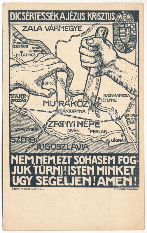 Description: Dicsértessék a Jézus Krisztus! Nem, nem, ezt sohasem fogjuk tűrni! isten minket úgy segéljen! Amen! - Muraköz - Besskó Károly Grafikai Műintézete / Hungarian irredenta art s: Helbing Aranka (EK)