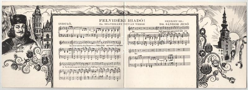 Description: Felvidéki riadó! Rákóczi Ferenc induló kottával. 2-részes irredenta kihajtható képeslap. Magyar Nemzeti Szövetség kiadása / Upper Hungarian irredenta marching song with music sheet, 2-tiled folding card s: Zsolt