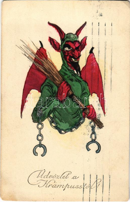 https://www.darabanth.com/en/457-Online-auction/457.0/Postcards/Krampus~1000034/1917-Udvozlet-a-Krampusztol-Krampus-with-chains-and-birch-H-H-i-W-Serie-1628-vagott-c~II3057265