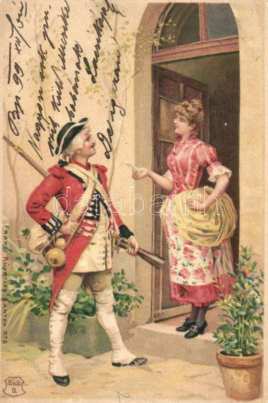 1899 French infantryman with woman, Franz Künstler Karten No. 6. litho...