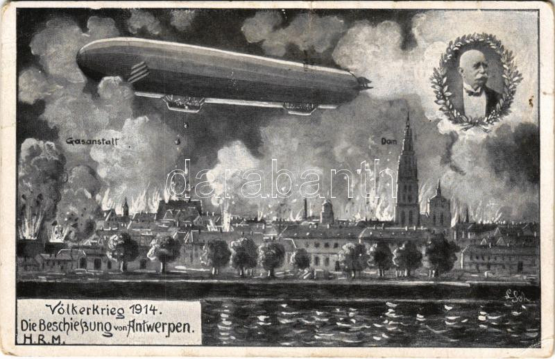 1914 Völkerkrieg 1914. Die Beschiessung von Antwerpen. Weltkrieg Postkarte, Zeppelin (EK)