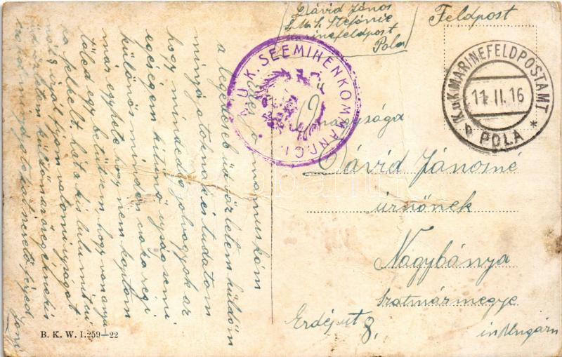 1916 Einnahme veines russischen Dorfes / WWI Austro-Hungarian K.u.K. military. B.K.W.I. 259-22. + "K.U.K. SEEMINENKOMMANDO" + "K.U.K. MARINEFELDPOSTAMT" (gyűrődések / creases)