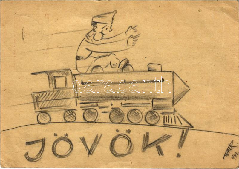 1942 Jövök! Második világháborús magyar katonai kézzel rajzolt levelezőlap / WWII Hungarian military hand-drawn postcard s: Fehér Ernő (EK)