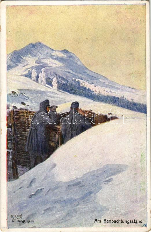 Description: Am Beobachtungsstand. Offizielle Karte für Rotes Kreuz, Kriegsfürsorgeamt Kriegshilfsbüro Nr. 361. / WWI Austro-Hungarian K.u.K. military art postcard, support fund s: R. Kargl (EK)