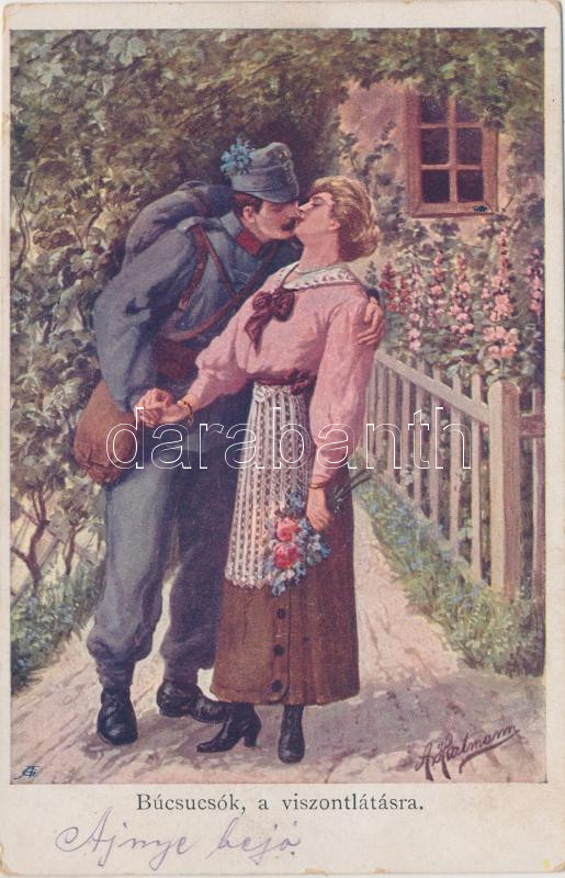 Búcsúcsók, a viszontlátásra / WWI Austro-Hungarian soldier with his lover, farewell kiss, Nr. 2345. C.H.W. VIII/2. s: A. Hartmann
