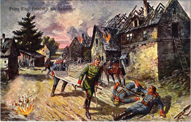 Description: Eitel Frigyes herceg mint szamaritánus, német katonák / Prinz Eitel Friedrich als Samariter / WWI German and Austro-Hungarian K.u.K. military art postcard, Prince Eitel Friedrich of Prussia as a frist-aid volunteer (fl)
