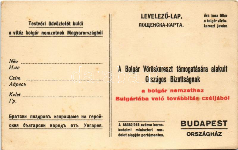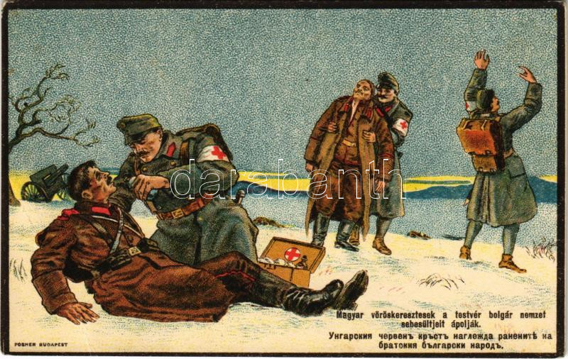 Magyar vöröskeresztesek a testvér bolgár nemzet sebesültjeit áolják. Testvéri üdvözletét küldi a vitéz bolgár nemzetnek Magyarországból... a Bolgár Vöröskereszt javára / WWI Austro-Hungarian K.u.K. military art postcard, Hungarian Red Cross medics giving first aid to Bulgarian soldiers. Charity card for the Bulgarian Red Cross fund, litho (EB)