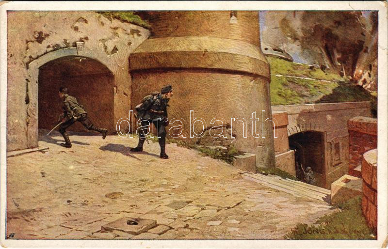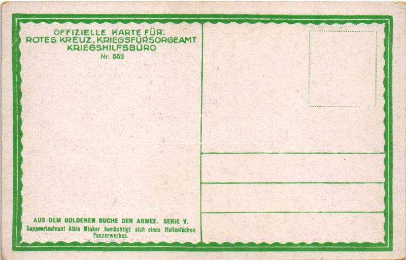Description: Sappeurleutnant Albin Mlaker bemächtigt sich eines italienischen Panzerwerkes. Offizielle Karte für Rotes Kreuz, Kriegsfürsorgeamt, Kriegshilfsbüro Nr. 552. Aus dem goldenen Buche der Armee Serie V. / WWI Austro-Hungarian K.u.K. military art postcard s: Fr. Jung (EB)