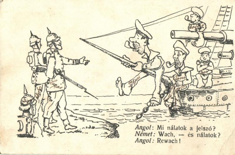 WWI military humorous card, Germand soldiers and English navy (EK)